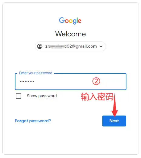 输入谷歌账号的登陆密码,然后点击Next 下一步