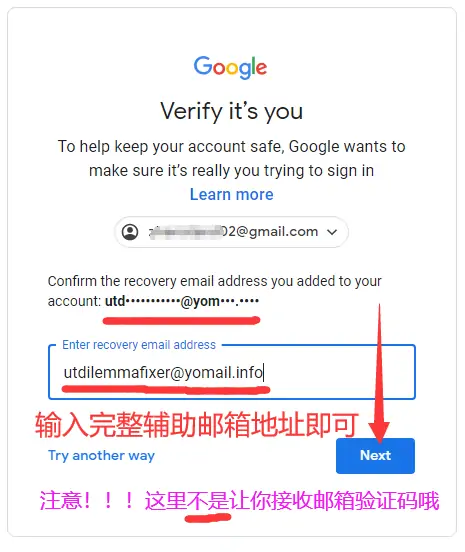 一定要先删除原始的辅助邮箱再输入您自己的之后,再点击Next下一步验证您的辅助邮箱,而不是进入这个页面直接点击Next验证哦!